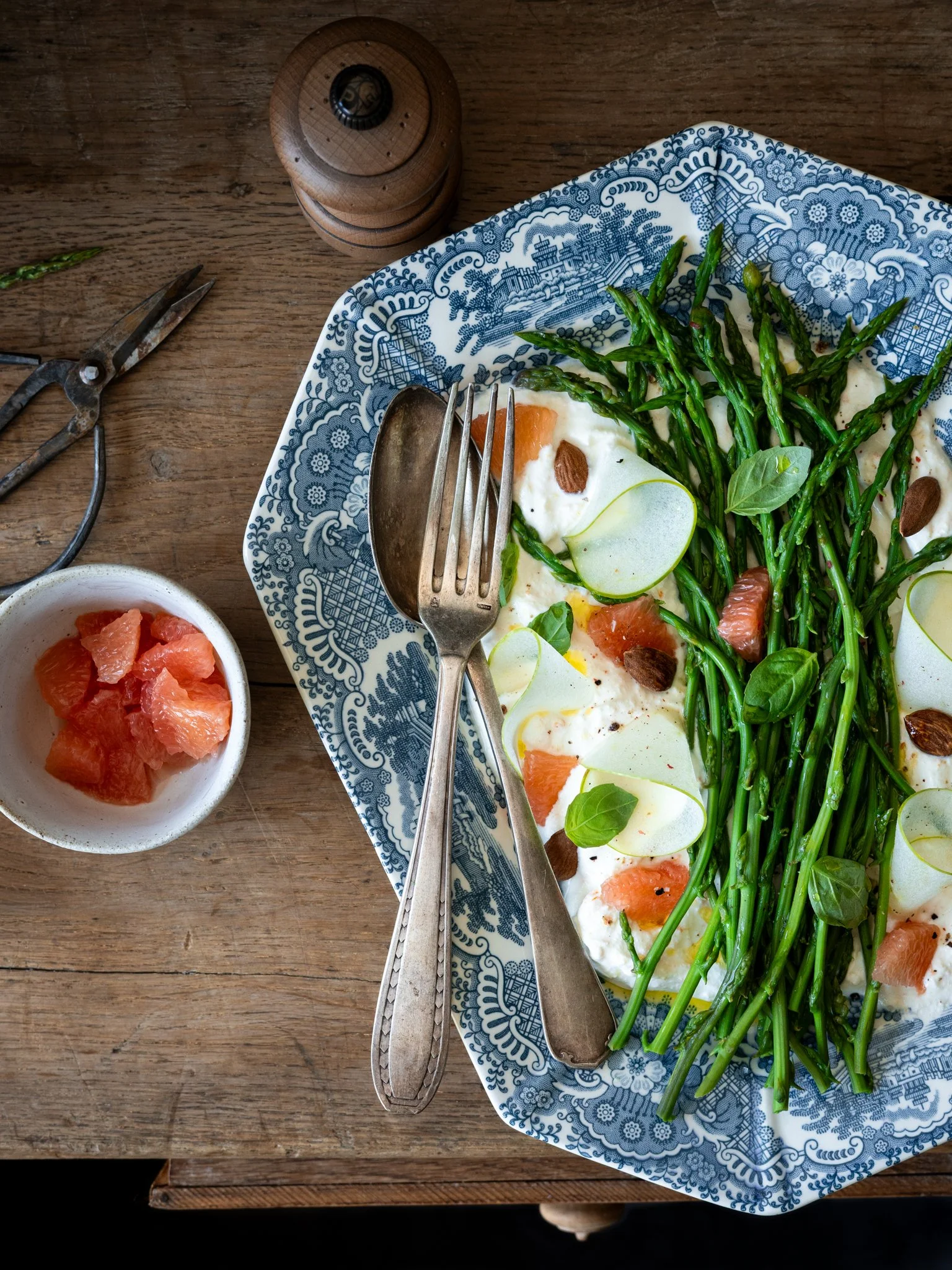 4 | A l’hora d’emplatar, estendre la crema de ricotta al fons del plat. Col·locar els espàrrecs silvestres al damunt en la mateixa direcció. Afegir els daus d’aranja i les làmines de poma de manera harmoniosa. Repartir les ametlles laminades i algunes fulles d’alfàbrega. Acabar amb un raig d’oli d’oliva i un pessic de flor de sal.