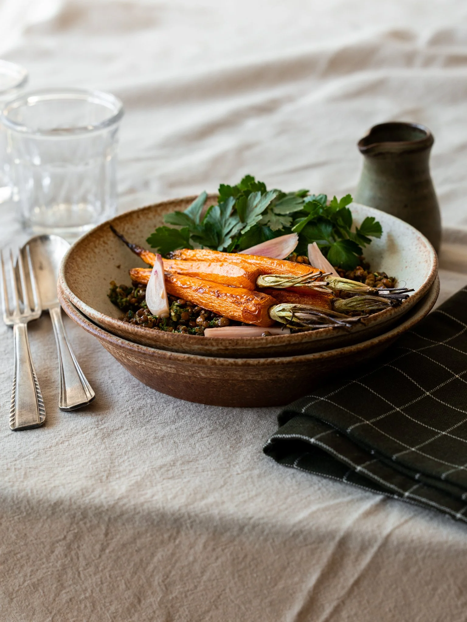 4 | En un bol gran, barrejar les llenties tèbies. Afegir el pesto de fulles i remenar bé per impregnar les verdures. Al moment de servir, afegir les pastanagues rostides, els pickles d’escalunya, el julivert picat i les nous trossejades.