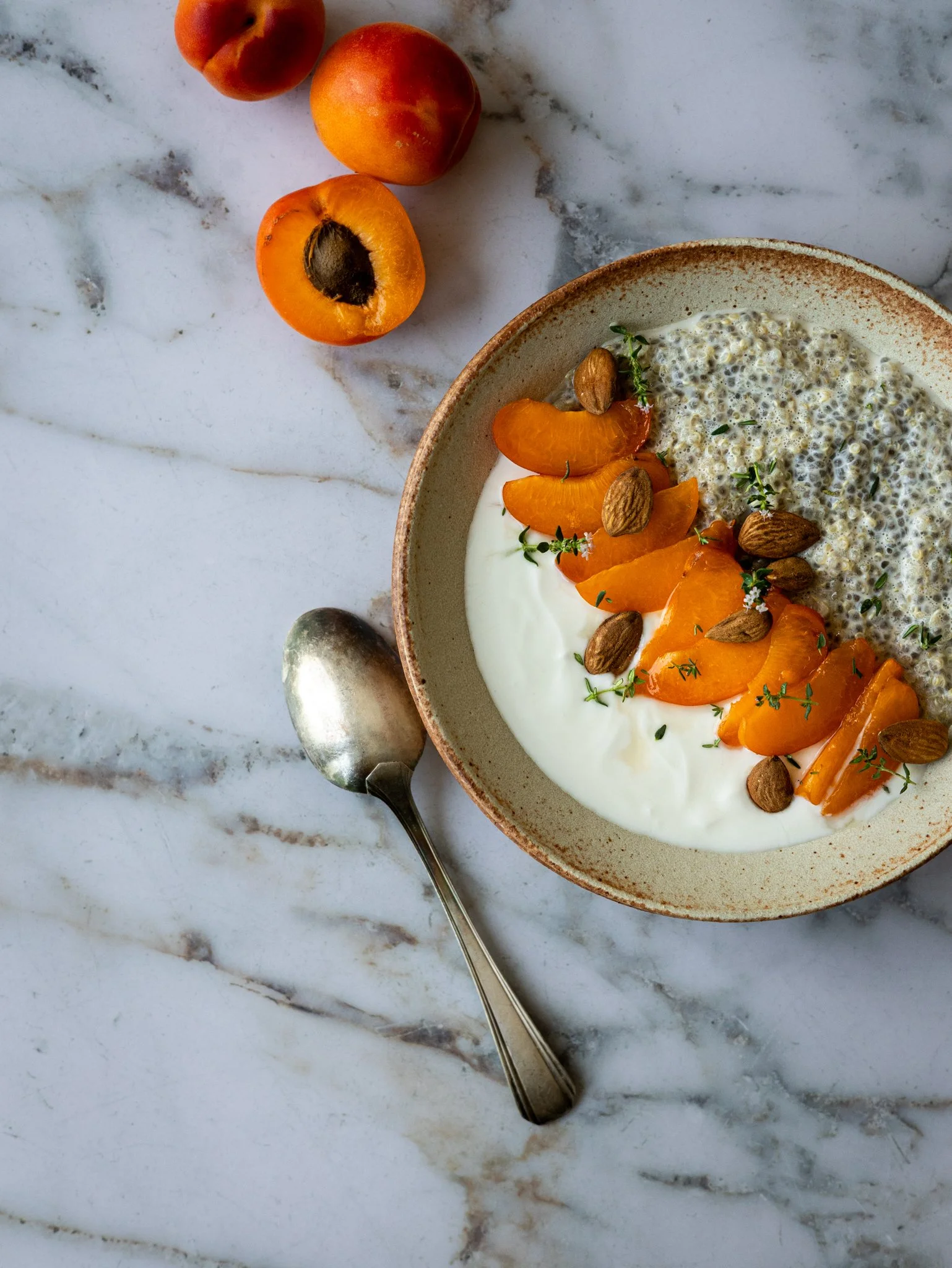 Acaba amb uns trossos d’albercoc rostit, una cullerada de iogurt de coco, un rajolí de mel (opcional) i ametlles torrades per sobre.