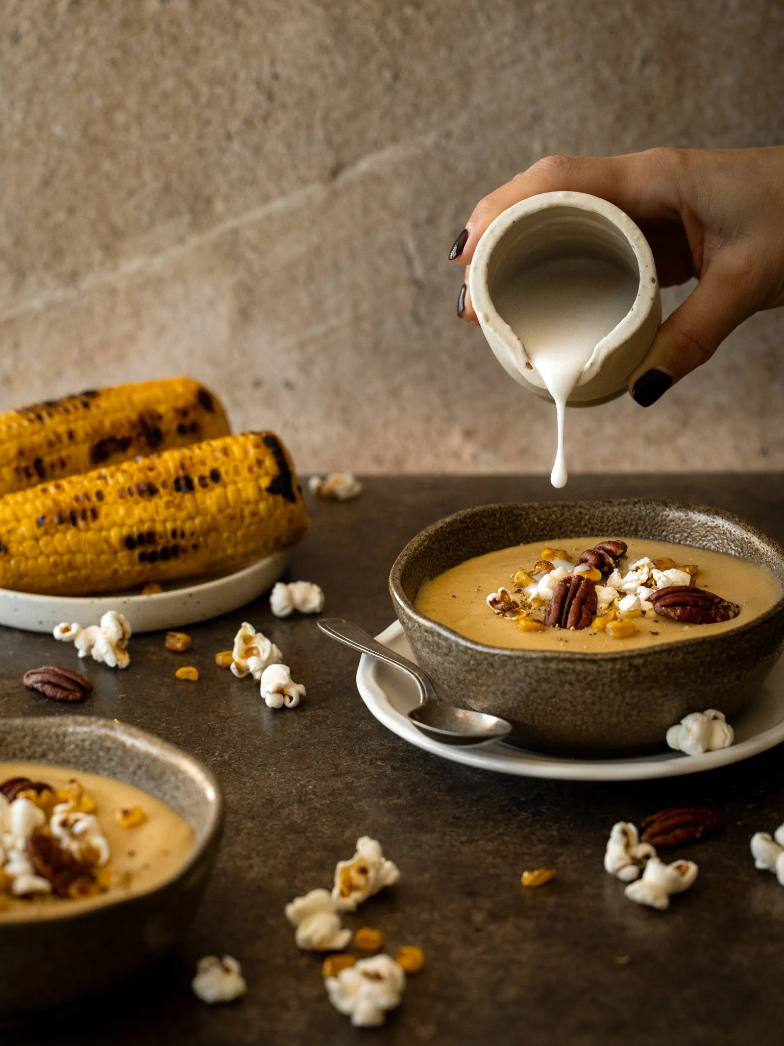 4 | Servir la sopa calenta en bols. Afegir-hi un raig de crema de coco, els grans de blat de moro rostits, els trossets de nous de pecan i, si es vol, unes crispetes just abans de servir.