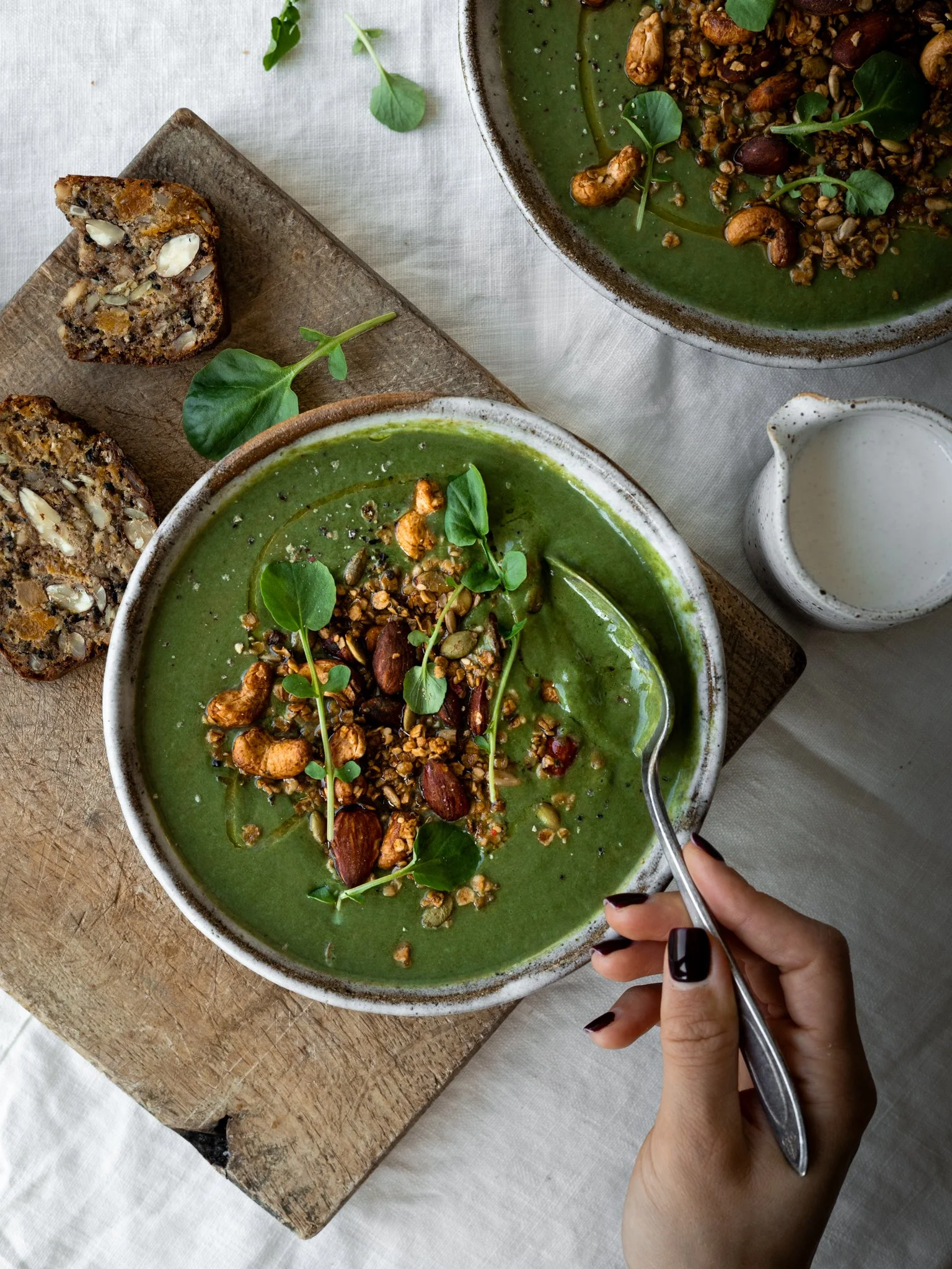 4 | Servir calent o tebi. Afegir a l’últim moment una bona cullerada de granola salat, algunes fulles de créixens frescos i un rajolí d’oli d’oliva.